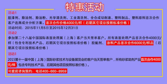 我公司(禾川化學(xué))攜成熟研發(fā)項(xiàng)目“表面處理劑:無(wú)渣磷化液、酸洗鈍化膏、無(wú)鉻鈍化液、硅烷陶化液、無(wú)鎳中溫封孔劑、化學(xué)銅添加劑、膠黏劑:硬化膠、環(huán)氧膠、密封膠、熱熔膠、導(dǎo)電膠等,膠黏劑助劑:環(huán)氧樹脂、聚氨酯樹脂、固化劑等。建筑助劑:砂漿添加劑、水機(jī)助磨劑、水泥緩蝕劑、阻垢劑、減水劑、速凝劑、膨脹劑、灌漿劑清洗劑:液晶面板清洗劑、堿性拋光液、等.表面活性劑:功能性聚醚、復(fù)合型表活等.加工液:全合成切削液、半合成切削液等.”等一系列配方分析服務(wù)項(xiàng)目參加此次行業(yè)的盛會(huì),期待與業(yè)內(nèi)專家與各界學(xué)者共同探討與研究表面處理及砂漿行業(yè)的最新動(dòng)態(tài)與市場(chǎng)前景。